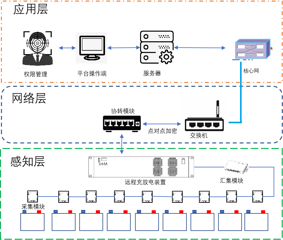基于(yú)現有石化通信網(wǎng)絡,研制以電池采(cai)集模塊和遠📞程充(chōng)放電🔞裝置爲物理(lǐ)感知層;各模塊間(jiān)的通訊及控制爲(wèi)🌐網絡交互🎯層;智能(néng)運維平台軟件爲(wei)平台層的蓄♻️電池(chi)組遠程智能運維(wéi)系統。