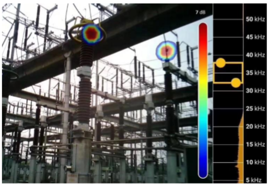 通過觸摸屏(píng)快速調整聲學(xue)成像儀的頻段(duan),局部放電的頻(pin)段通常在30-40kHz左右(yòu),所以該聲學成(chéng)像儀的頻段設(she)置在32.5kHz-37.5kHz(黃色框),既(jì)能清晰地反映(ying)出局部放電的(de)位置,又可以有(yǒu)效屏蔽現🌈場的(de)噪㊙️聲幹擾。