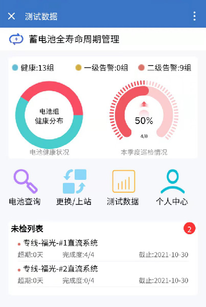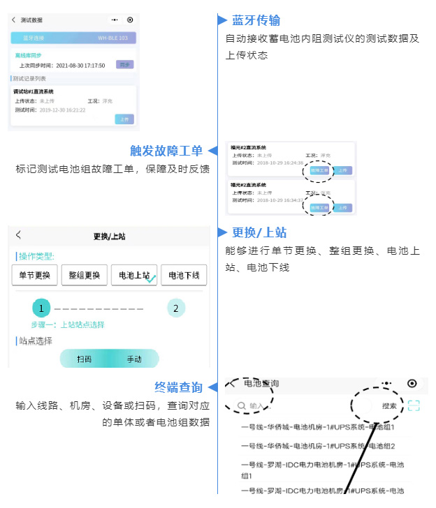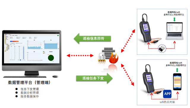 手持式(shi)終端通過藍牙連(lián)接與FBR-6000NT進行雙向數(shu)據同步,成功連接(jie)識别後終端“小程(cheng)序”可🛀以直接顯示(shi) 作業任務信息以(yǐ)及完成情況統計(jì)信息,自動接收雲(yún)端智能平台上創(chuàng)建的測試蓄電池(chi)組信息,并👨❤️👨手動同(tong)步到蓄電池内阻(zu)測試儀上。