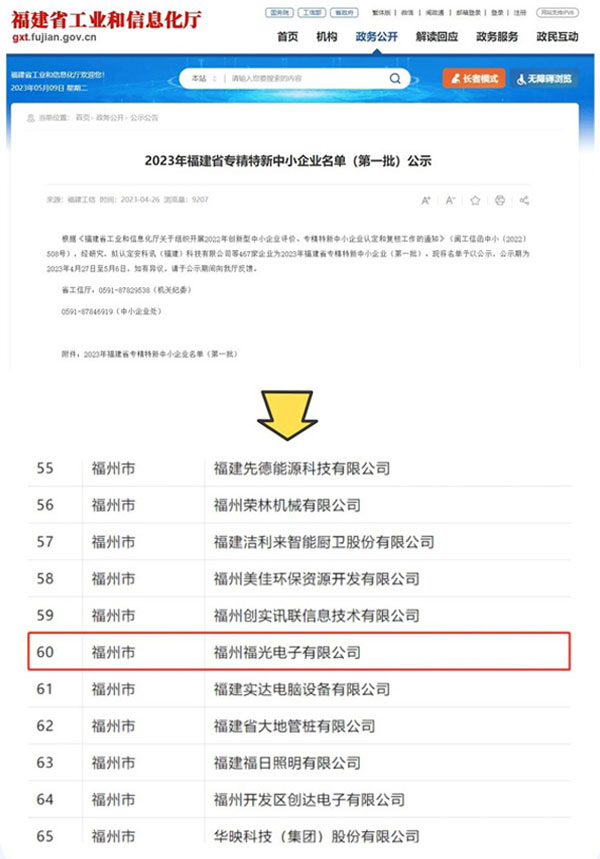 12月4日(rì),福建省(shěng)工業和(hé)信息化(hua)廳發布(bù)《2023年福建(jian)省專精(jīng)特新中(zhōng)小🐆企業(ye)名單(第(dì)一批)公(gōng)示》,福州(zhōu)福光電(dian)子有限(xian)公司順(shùn)利通過(guo)審核并(bìng)且完成(cheng)公示,被(bei)評爲福(fú)建省“專(zhuan)精特新(xīn)中小企(qi)業”和“創(chuang)新型中(zhōng)小企🧑🏽🤝🧑🏻業(yè)”兩項殊(shū)㊙️榮