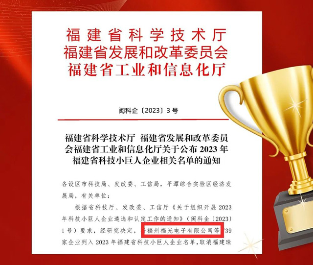 2025年12月4日,根據省(shěng)科技廳、發改 小巨(jù)人企業遴選和(he)認定工作的通(tōng)知》,福州 福光電子有(you)限公司被評定(ding)爲【福建省科技(ji)小 巨(jù)人企業】。這是政(zhèng)府部門對福光(guāng)科技創新 工作的認(ren)可,也是對福光(guang)市場發展潛力(li)及綜 合實力的高度(dù)肯定!