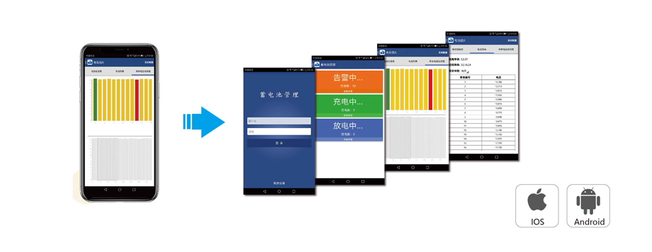 通過無(wu)線網絡(luò),采用手(shou)機可實(shi)時查看(kan)所有蓄(xù)電池♈組(zǔ)實時監(jiān)控測試(shì)數據(單(dan)體電壓(ya)、單體溫(wen)度、内阻(zǔ)數🥵據、放(fang)電數據(ju)、充電數(shu)據、均衡(heng)數據及(ji)告警信(xìn)息),以圖(tu)形和數(shù)💞字體現(xian)