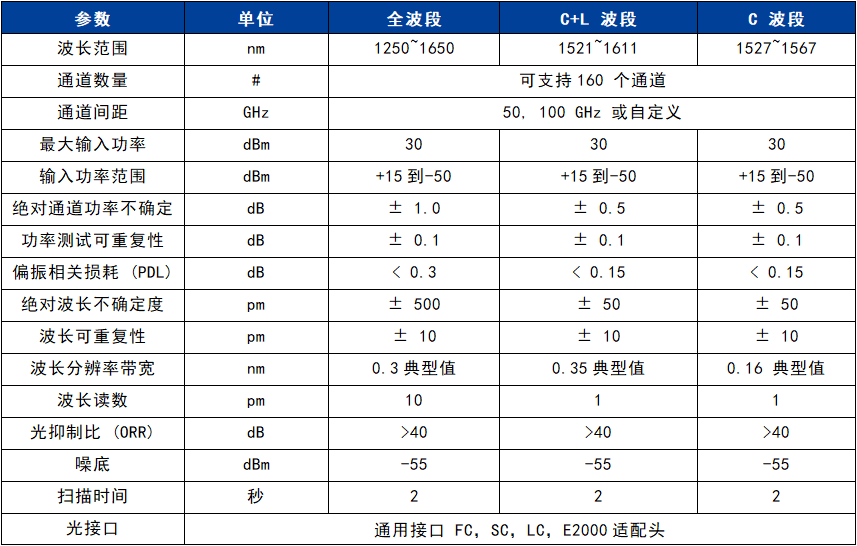 ● S, C 和 C+L 波段的(de)波長範圍技術(shù)參數